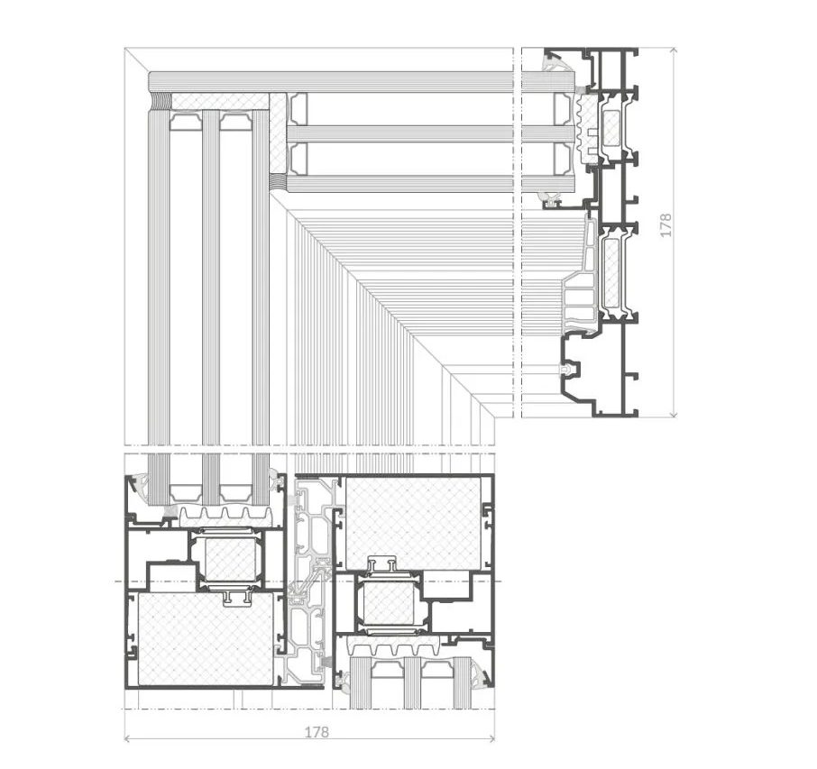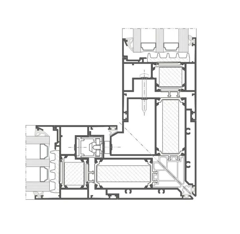 For 90-degree corner constructions, an increasingly popular solution instead of using an aluminum connector is a fully glass joint. Another interesting option is stepped glass mounted on the sash. In this case, only the frame and the glass are visible, with the glazing covering the sash and the mullion.