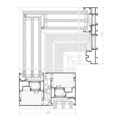 The AS 178HS PRO SLIM system uses a number of innovative technical solutions, such as a systemic solution of all-glass covers on the sashes, the possibility of achieving threshold-free development, crimped connections of aluminium frames or the possibility of glazing from the inside and outside. Thanks to the use of a systemic connection of door frames in this system, doors can reach their maximum width, and their height can be up to 3,300 mm.