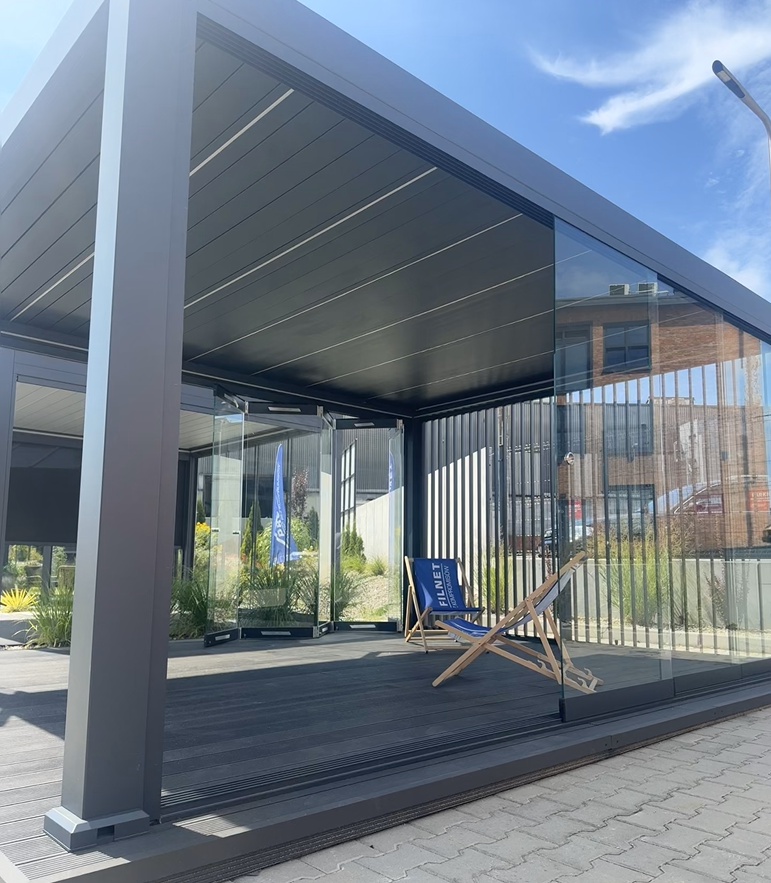 Easy Slide is a non-insulated aluminium sliding door system that allows for comfortable use of covered outdoor spaces regardless of weather and wind conditions. The Easy Slide system offers a wide range of opening options, while the frameless sashes ensure an elegant appearance and maximum transparency. Its main advantages include an aesthetic, fully glazed sash without the need for surrounding profiles, as well as the option of a bottom frame or a low-threshold solution.