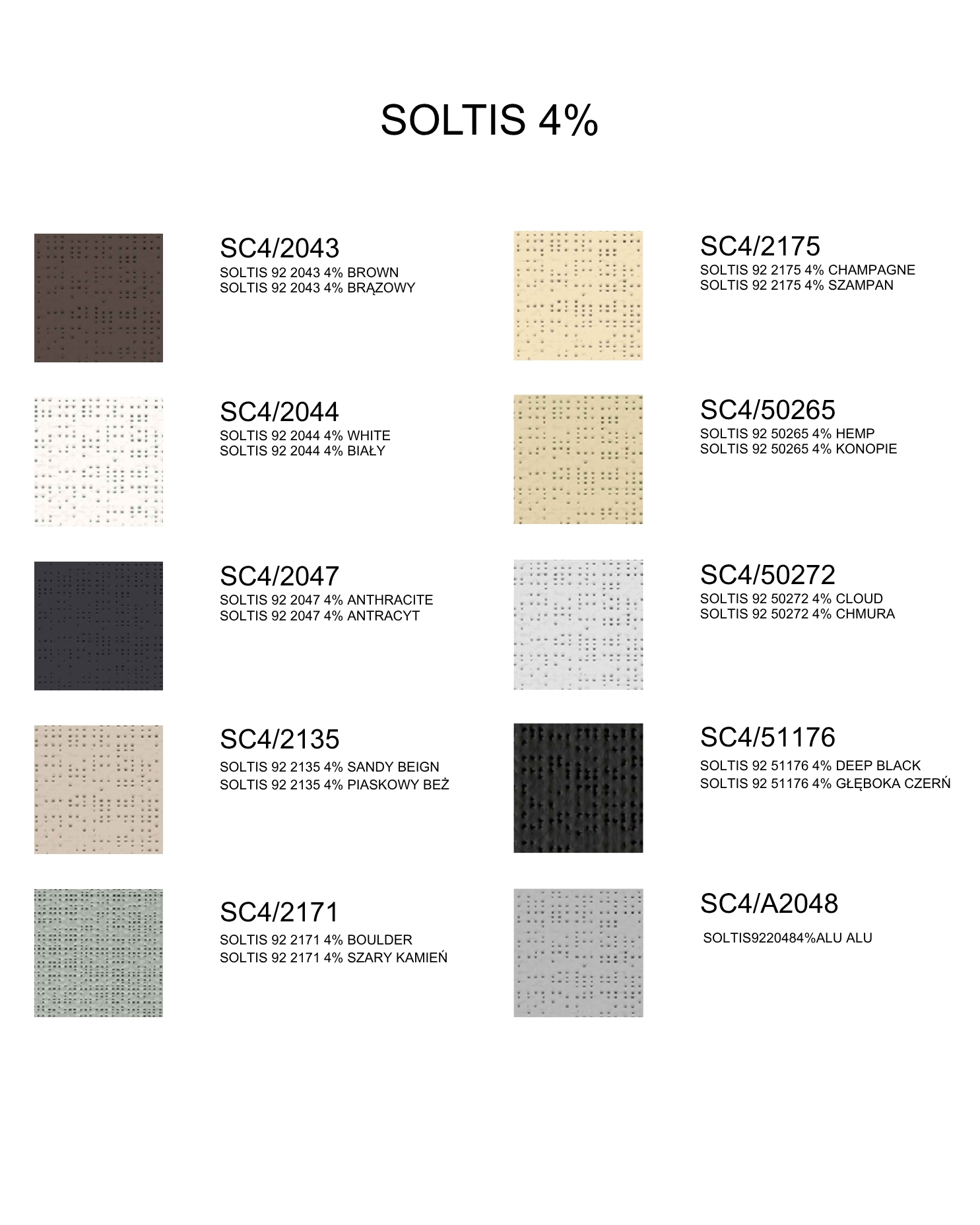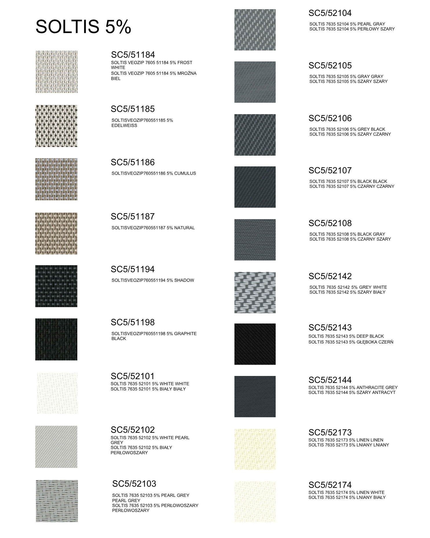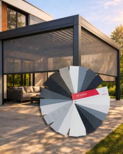 Fabrics – functionality and design. A wide range of screen fabrics is available. Openness factor: 0%, 1%, 4%, 5%. They provide light control, privacy, protection against interior overheating. Available colors include: whites, greys, anthracites, beiges and natural tones, deep black.