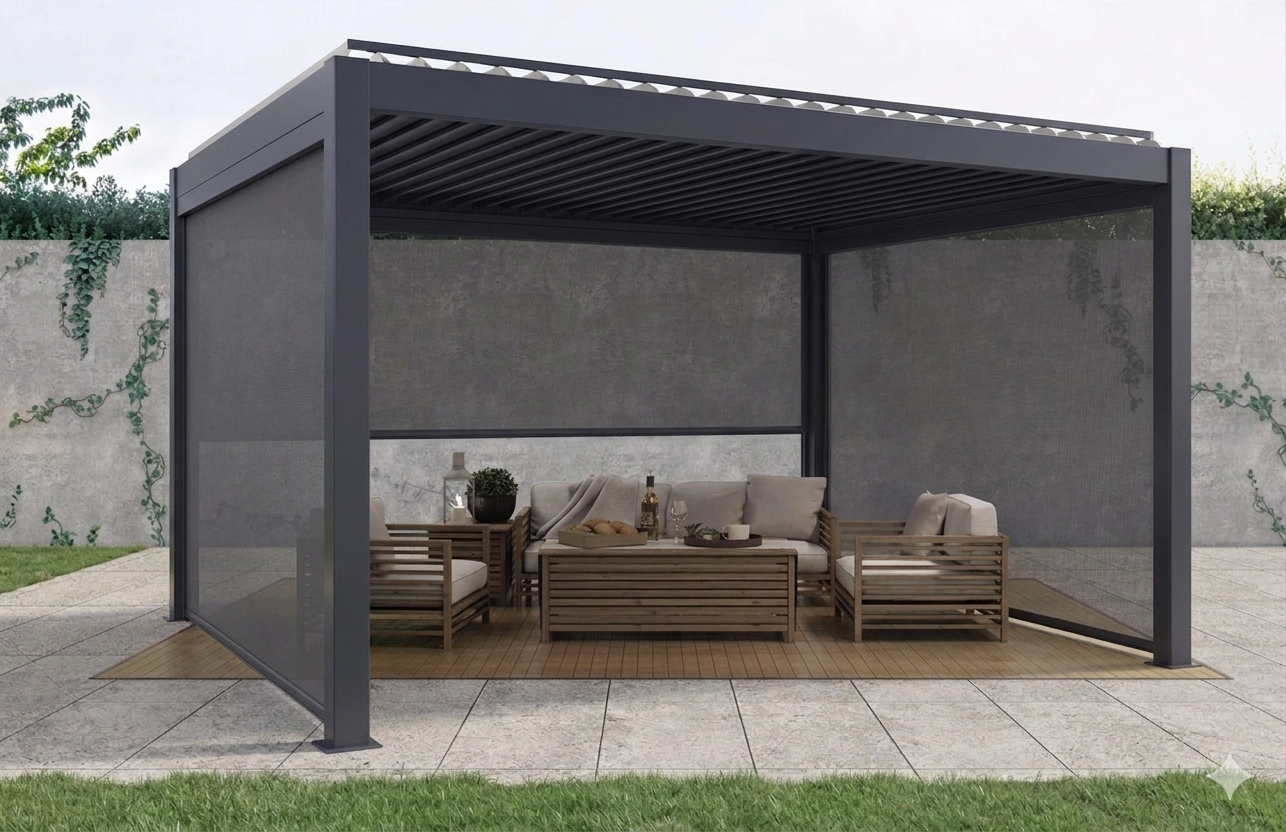 ZIP-Screen ECO integrates seamlessly with aluminum pergolas, terrace roofs, winter gardens, large sliding systems. Installation options: between structural posts, outside the structure, in combination with slide glass systems.
