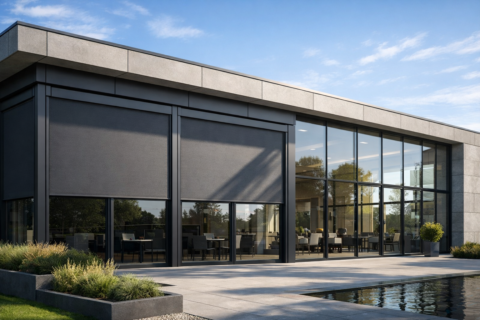 A modern shading system designed for large glass surfaces and outdoor areas. ZIP-Screen ECO is an advanced sun protection solution created with large dimensions and contemporary architecture in mind. Thanks to the use of a 120 × 150 mm cassette, the system allows installations with widths of up to 6000 mm.